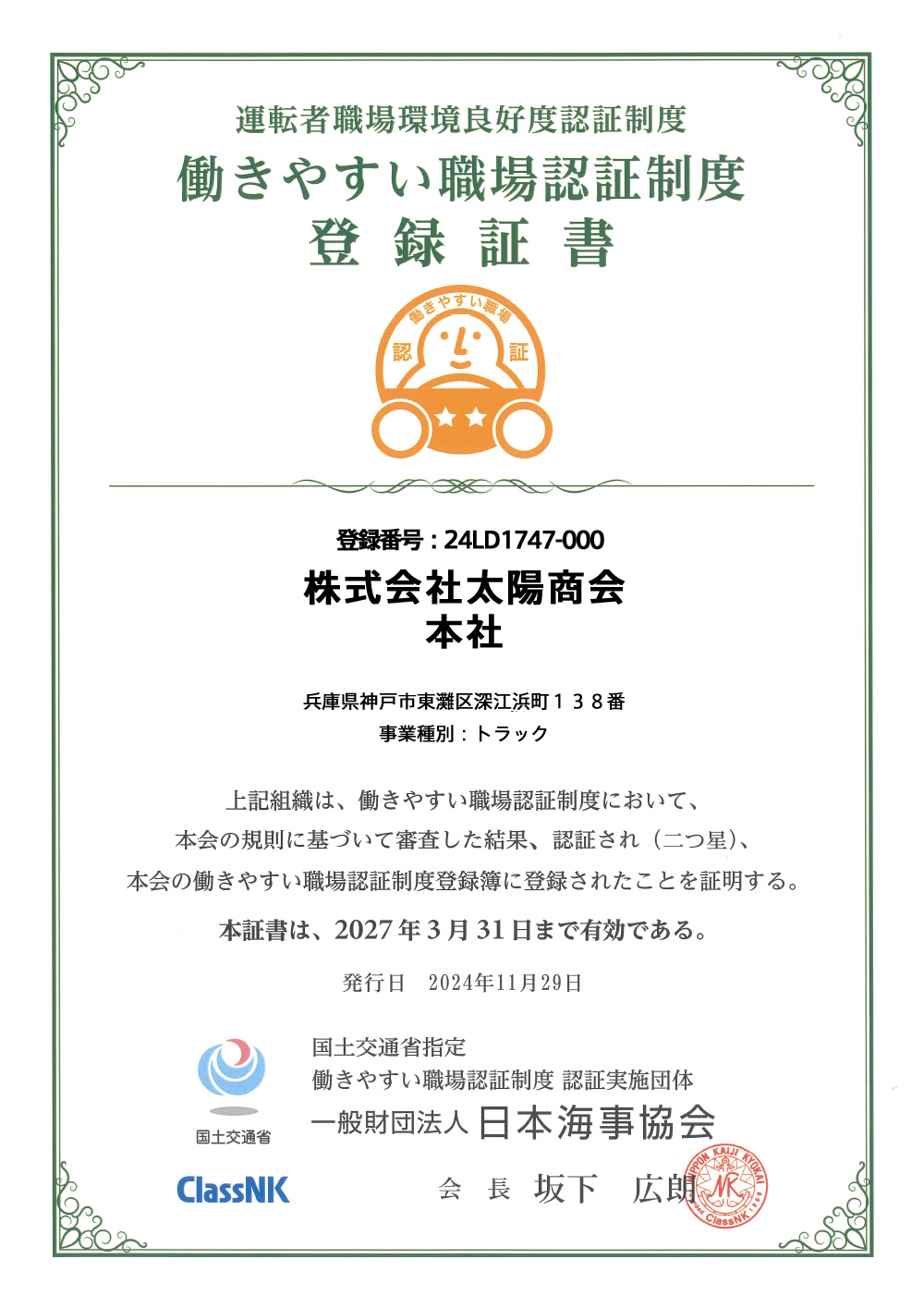国土交通省では、運転者不足に対応するための総合的な取組の一環として 、自動車運送事業者の運転者の労働条件や労働環境を第三者機関が評価する「働きやすい職場認証制度」を2020年度に創設しました。